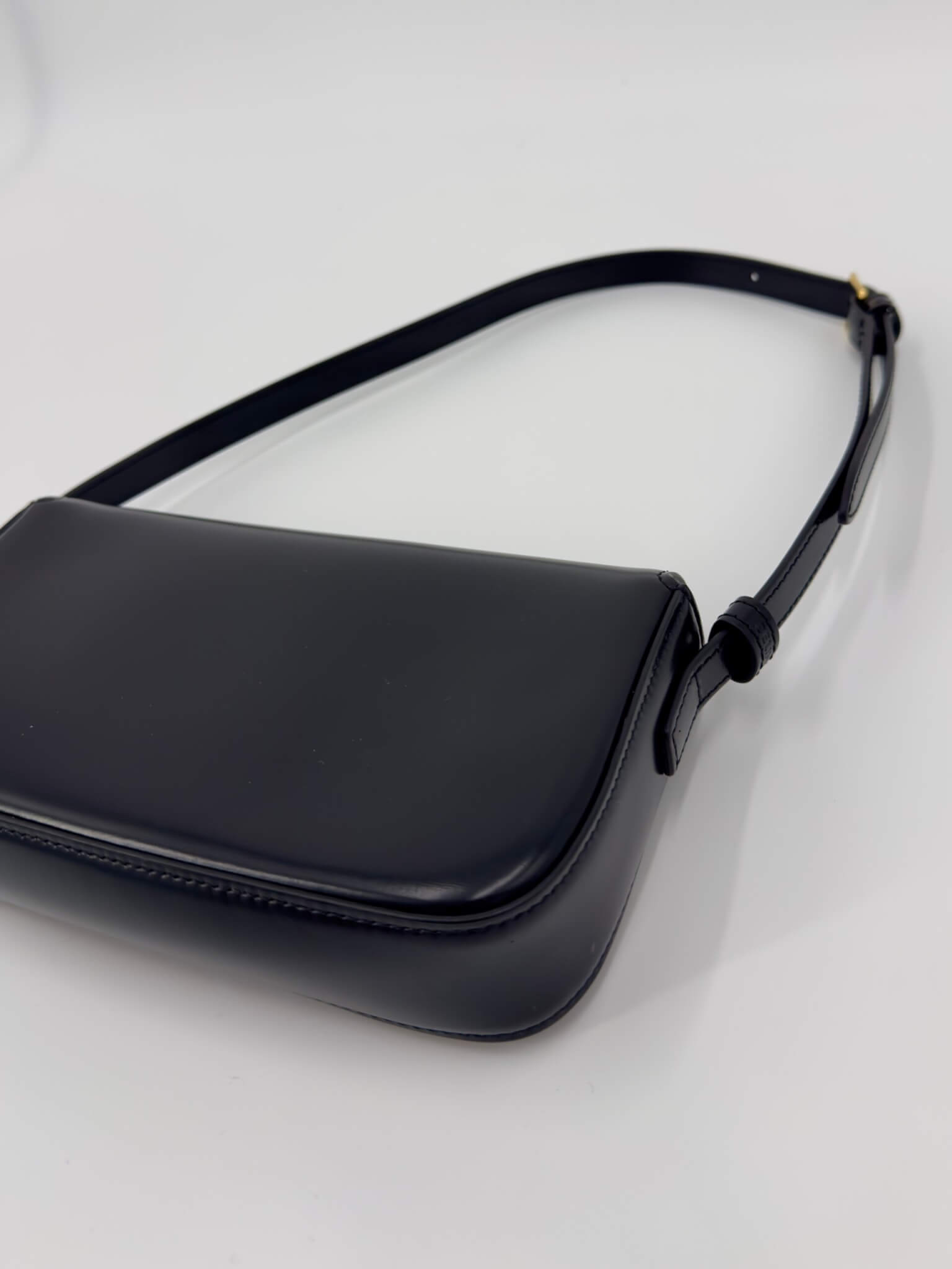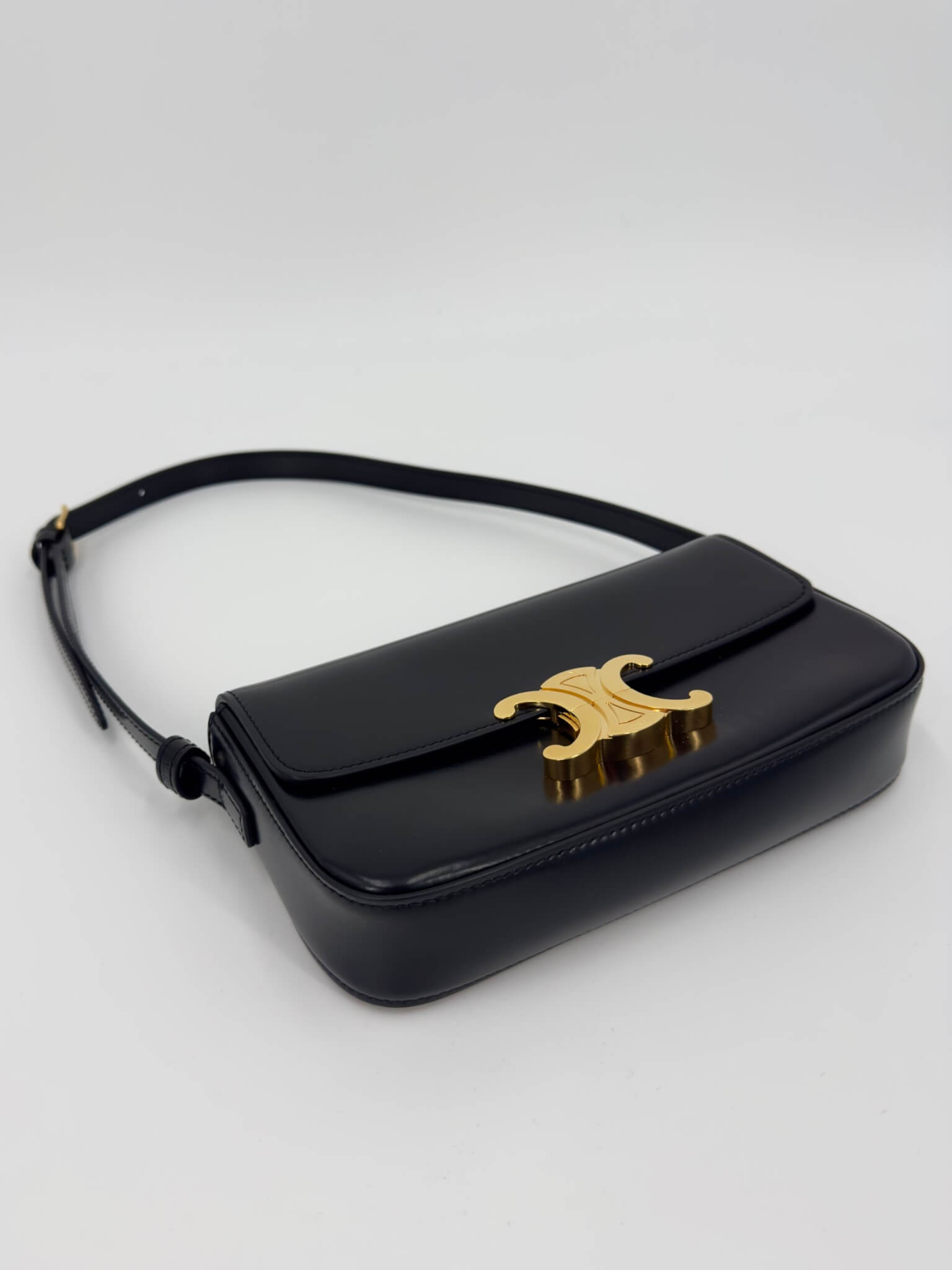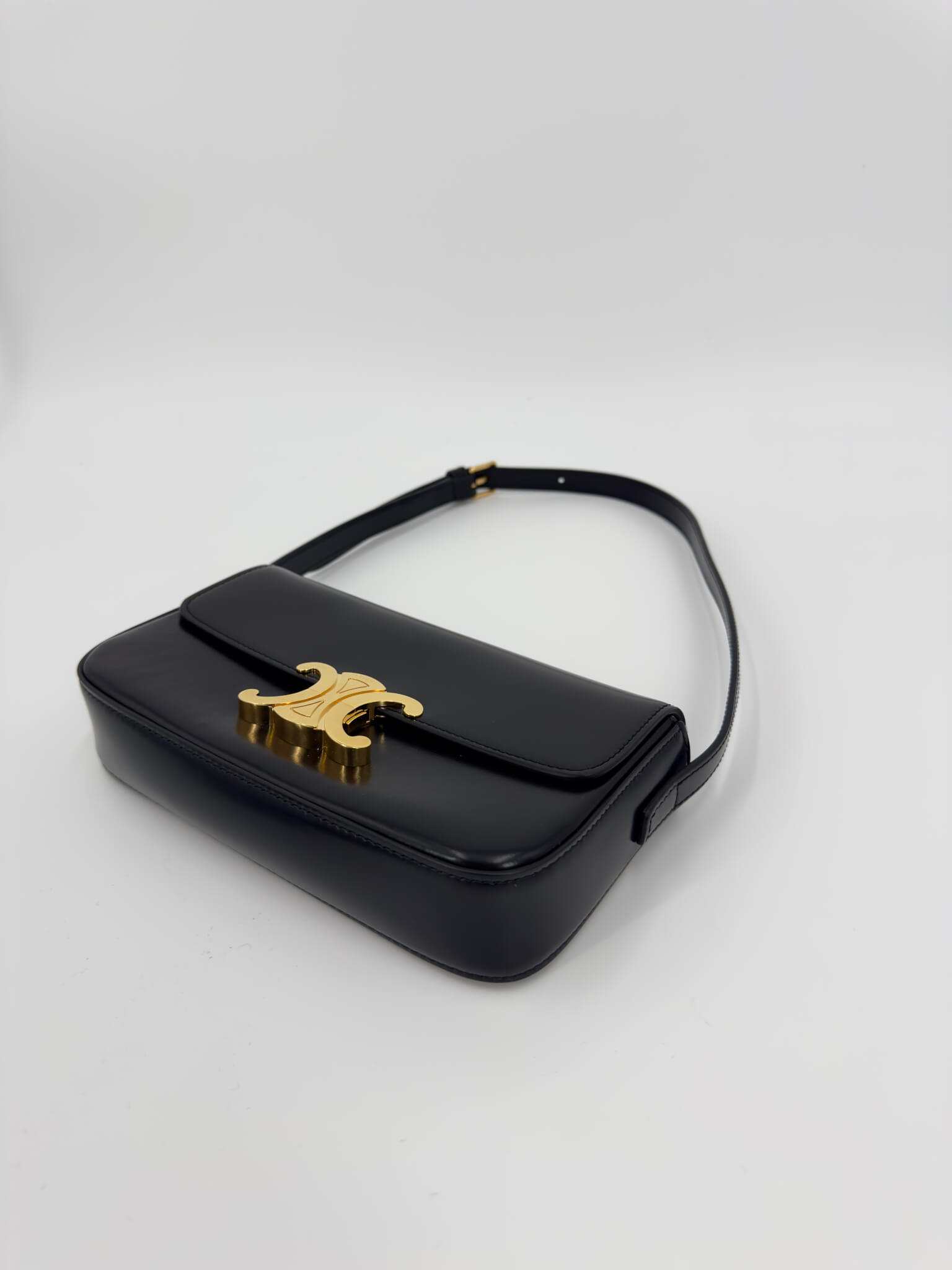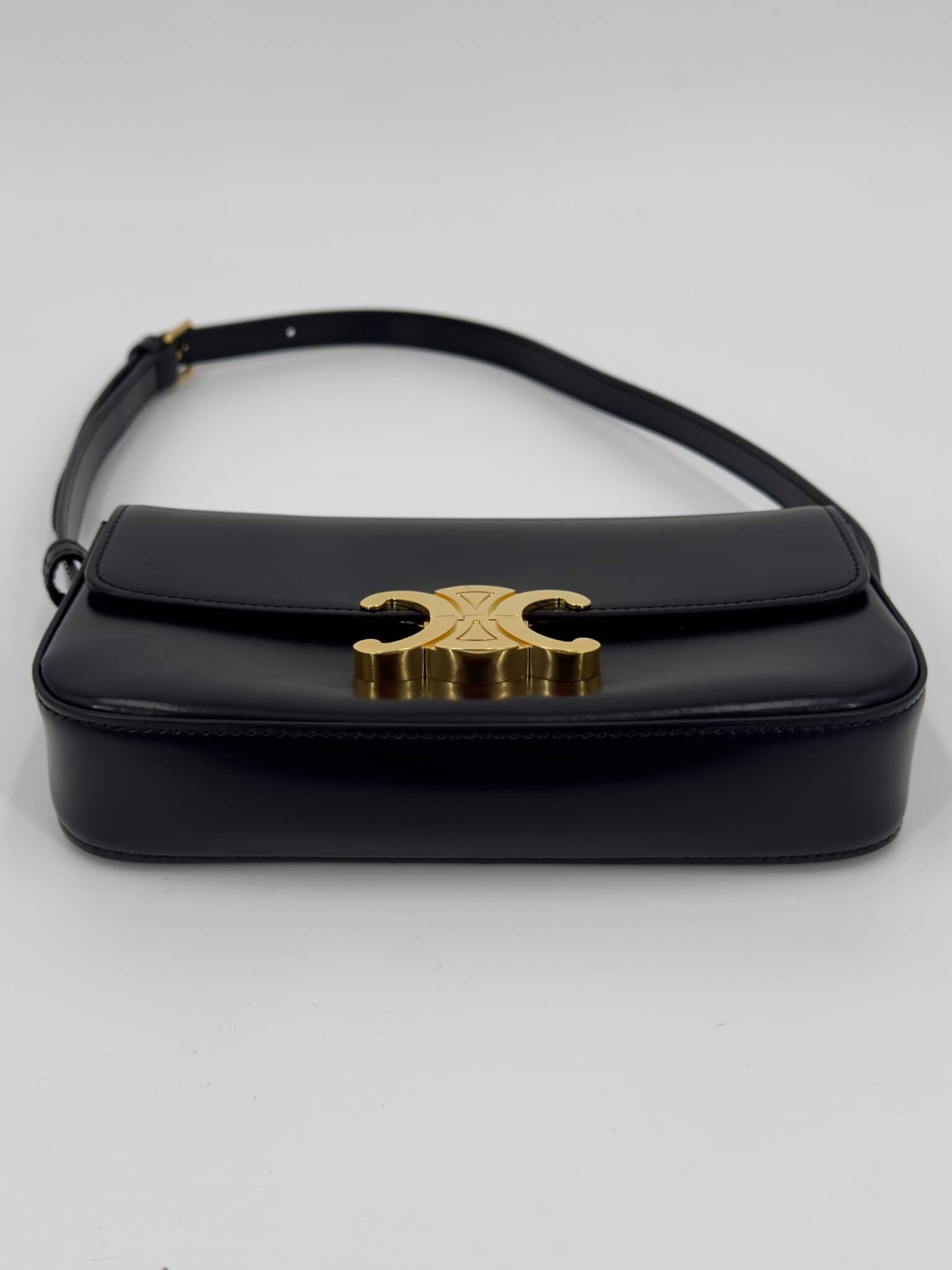100% cuir de veau satiné noir. Fermoir Triomphe finition or.