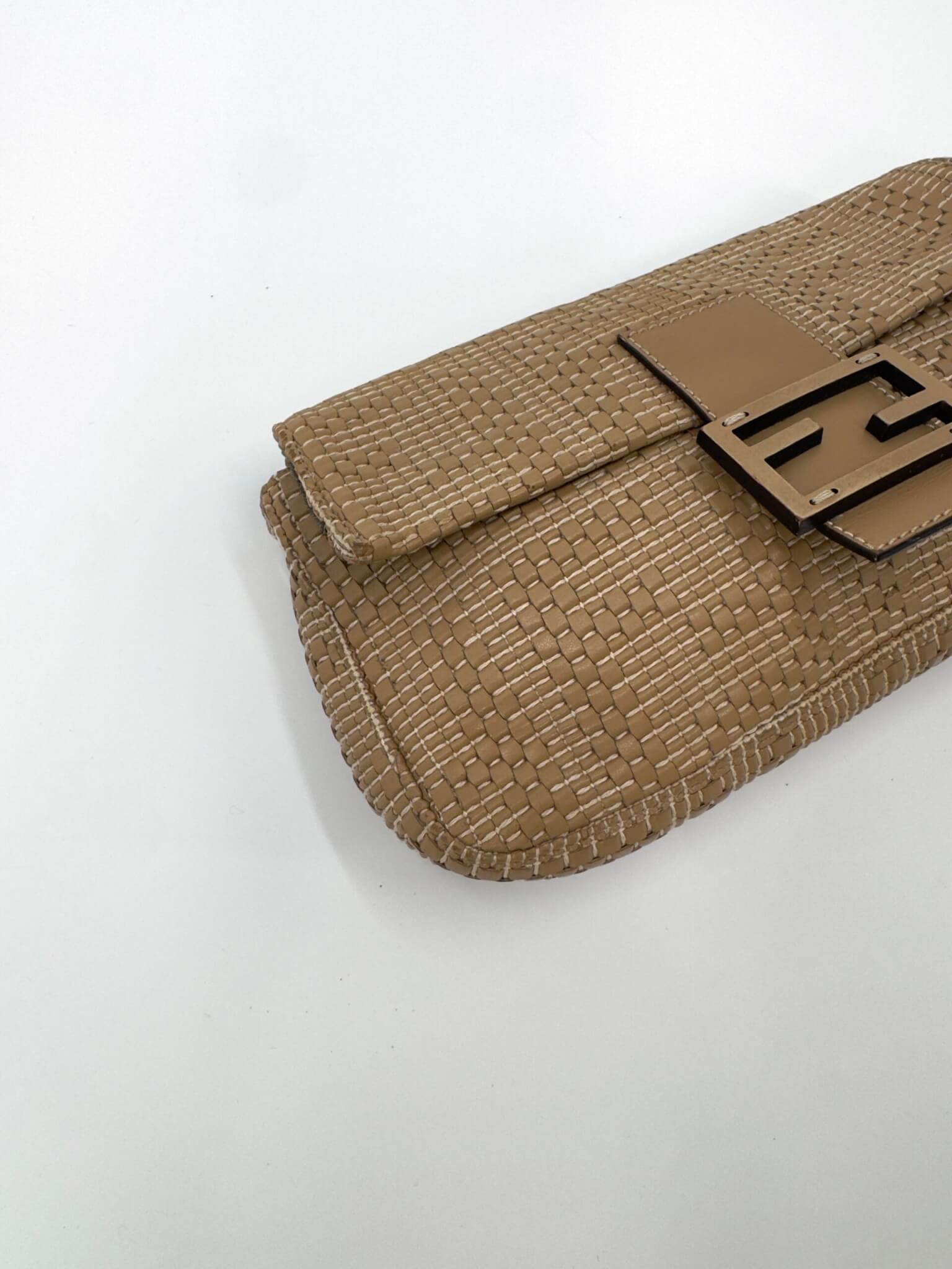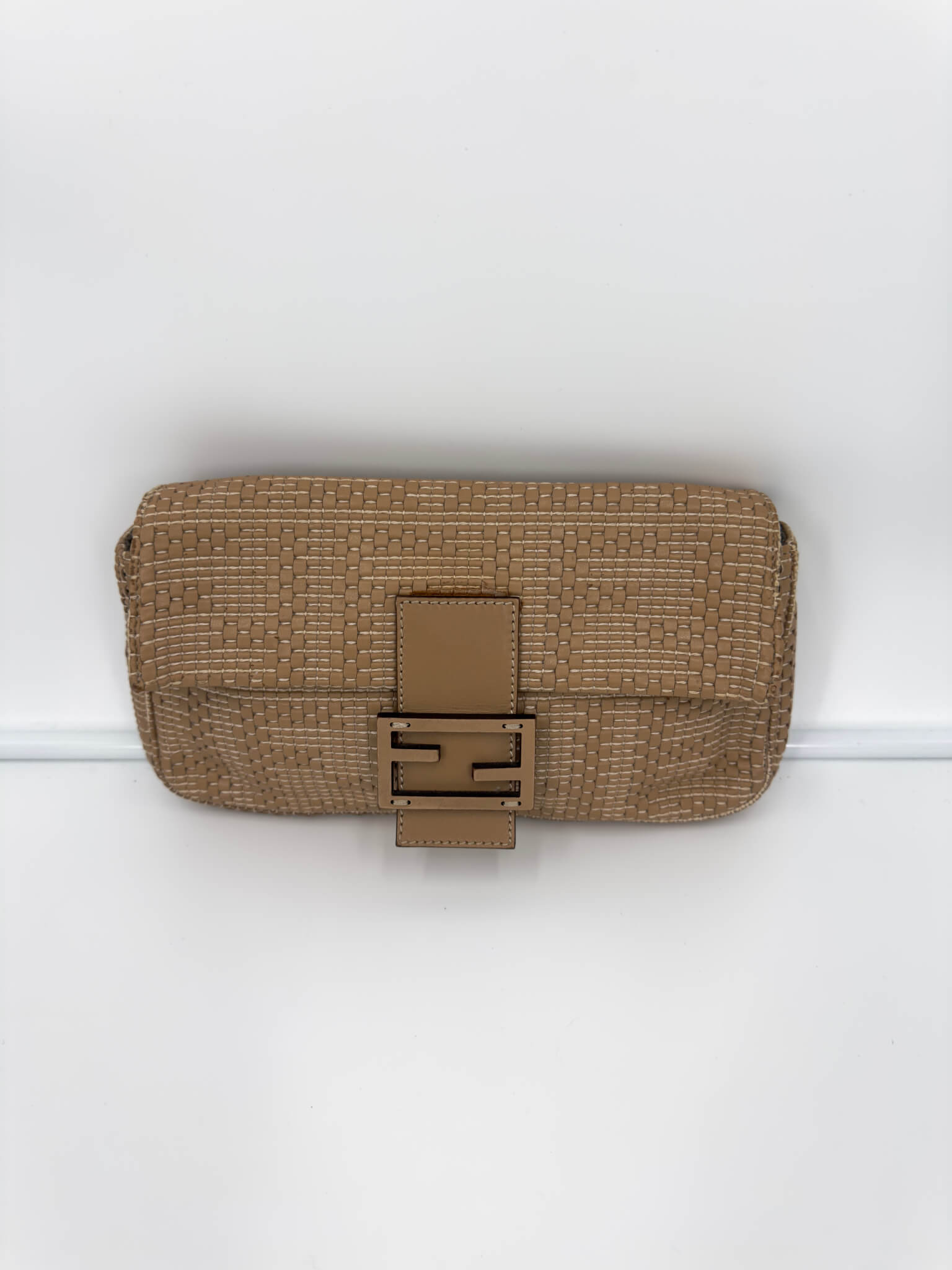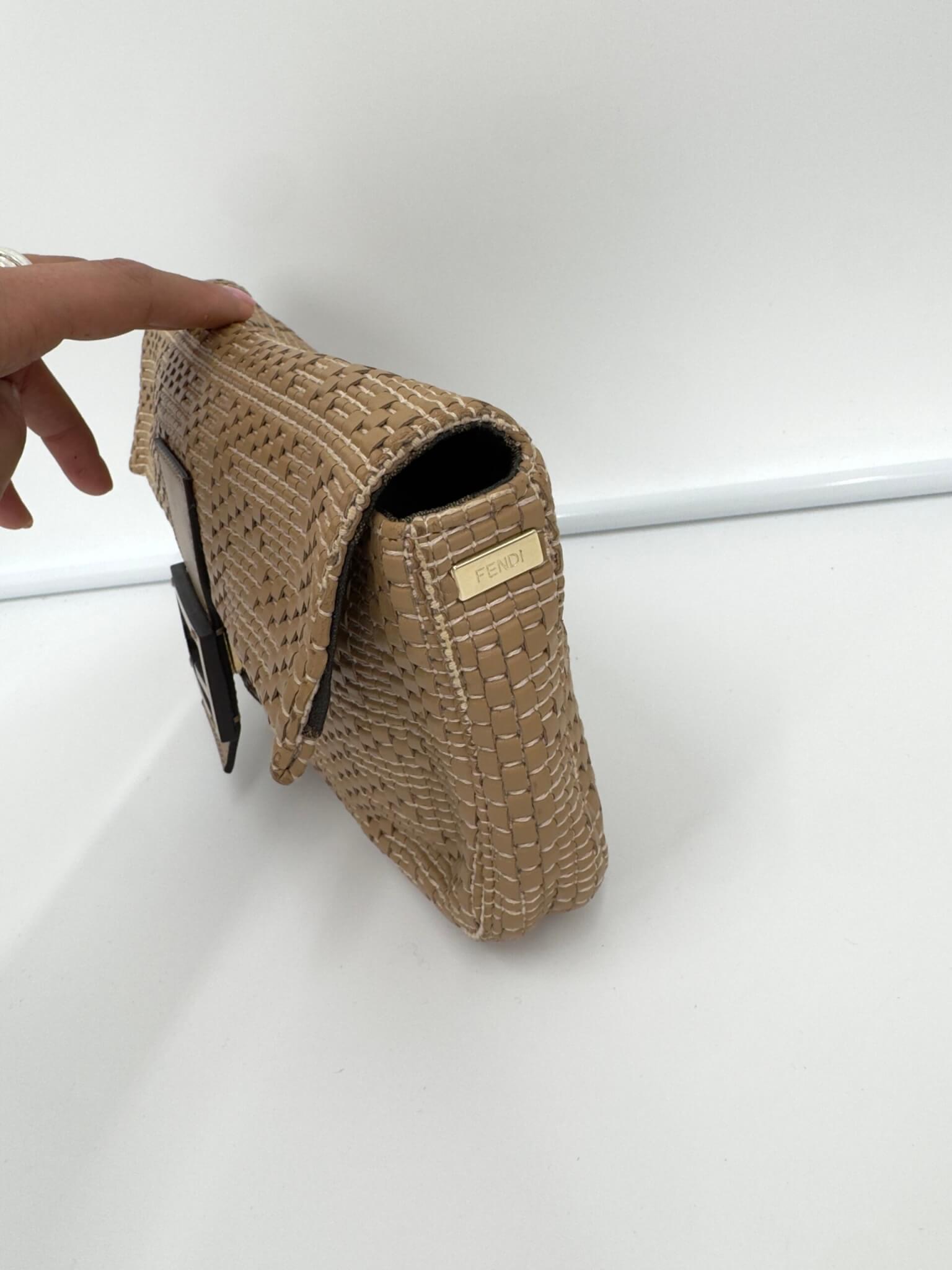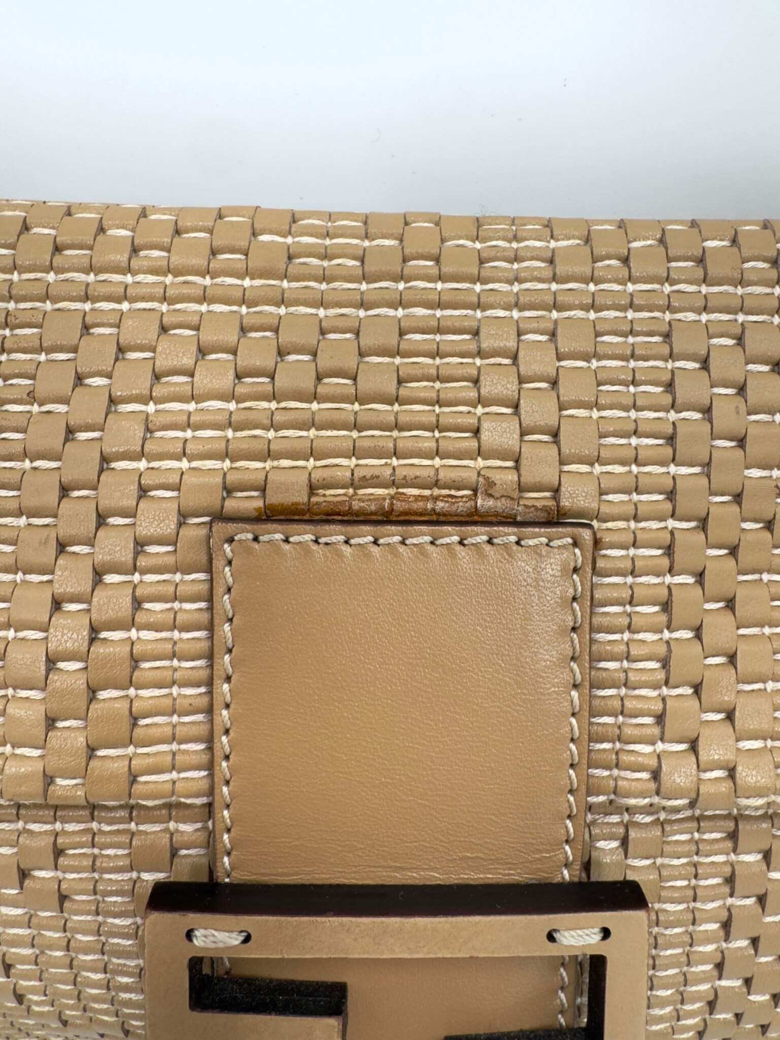 Sac pochette Fendi Baguette iconique en cuir tressé beige.