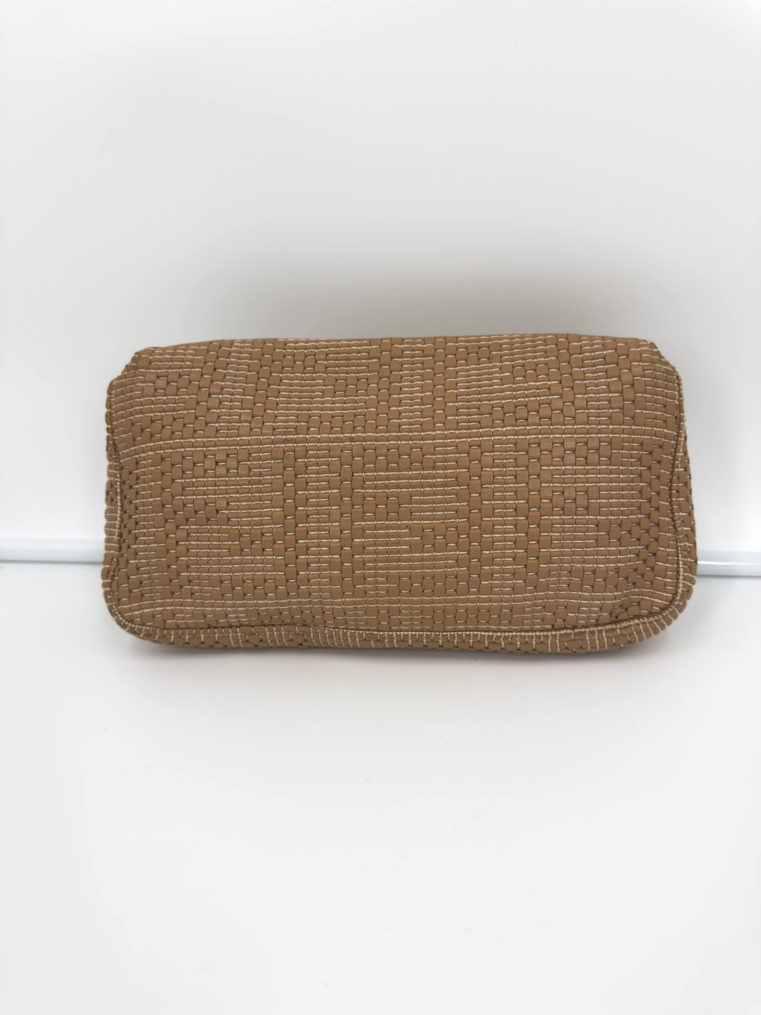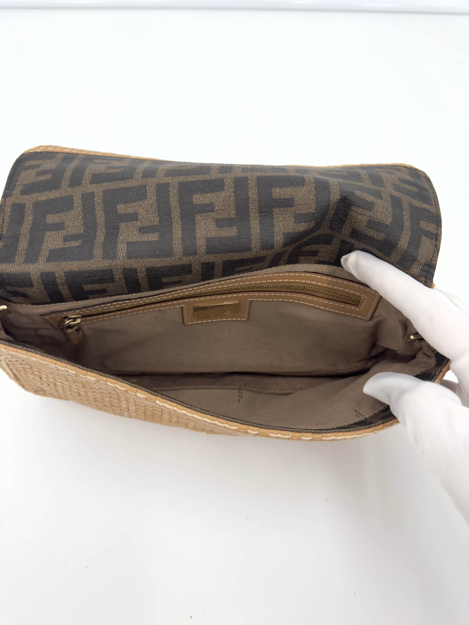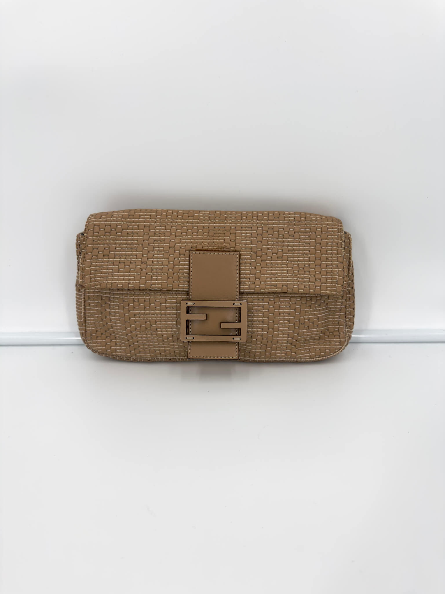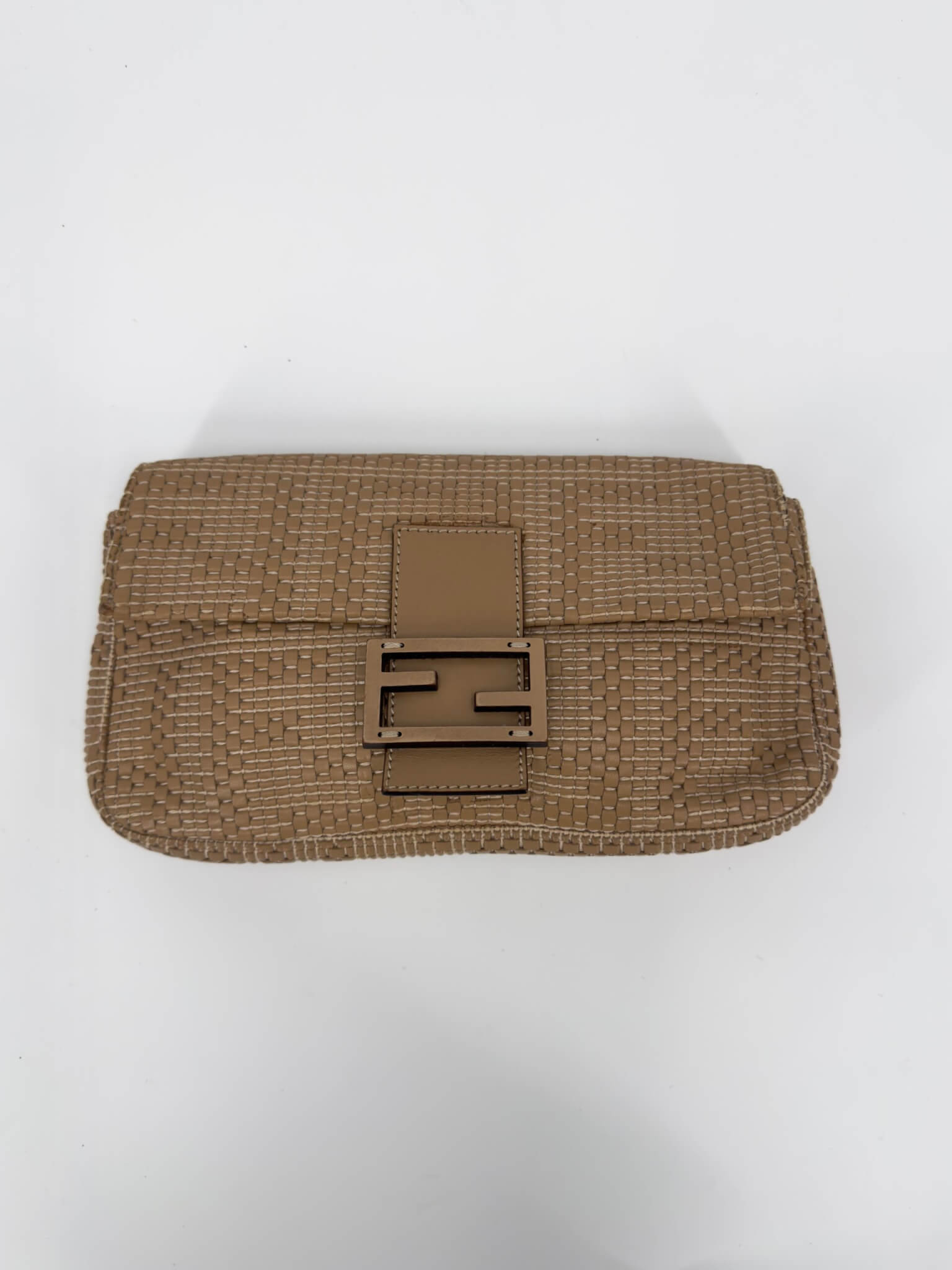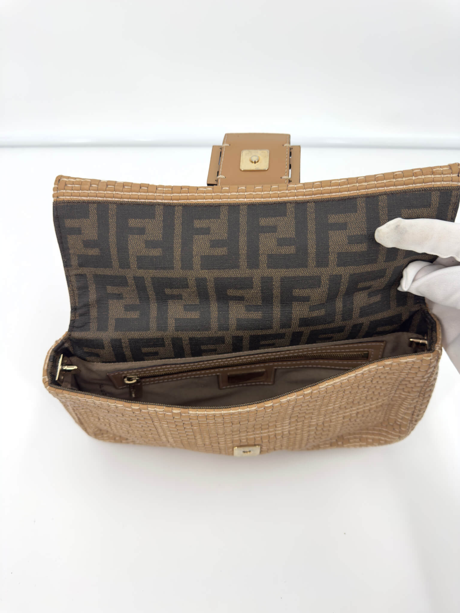 Sac pochette Fendi Baguette iconique en cuir tressé beige.