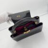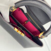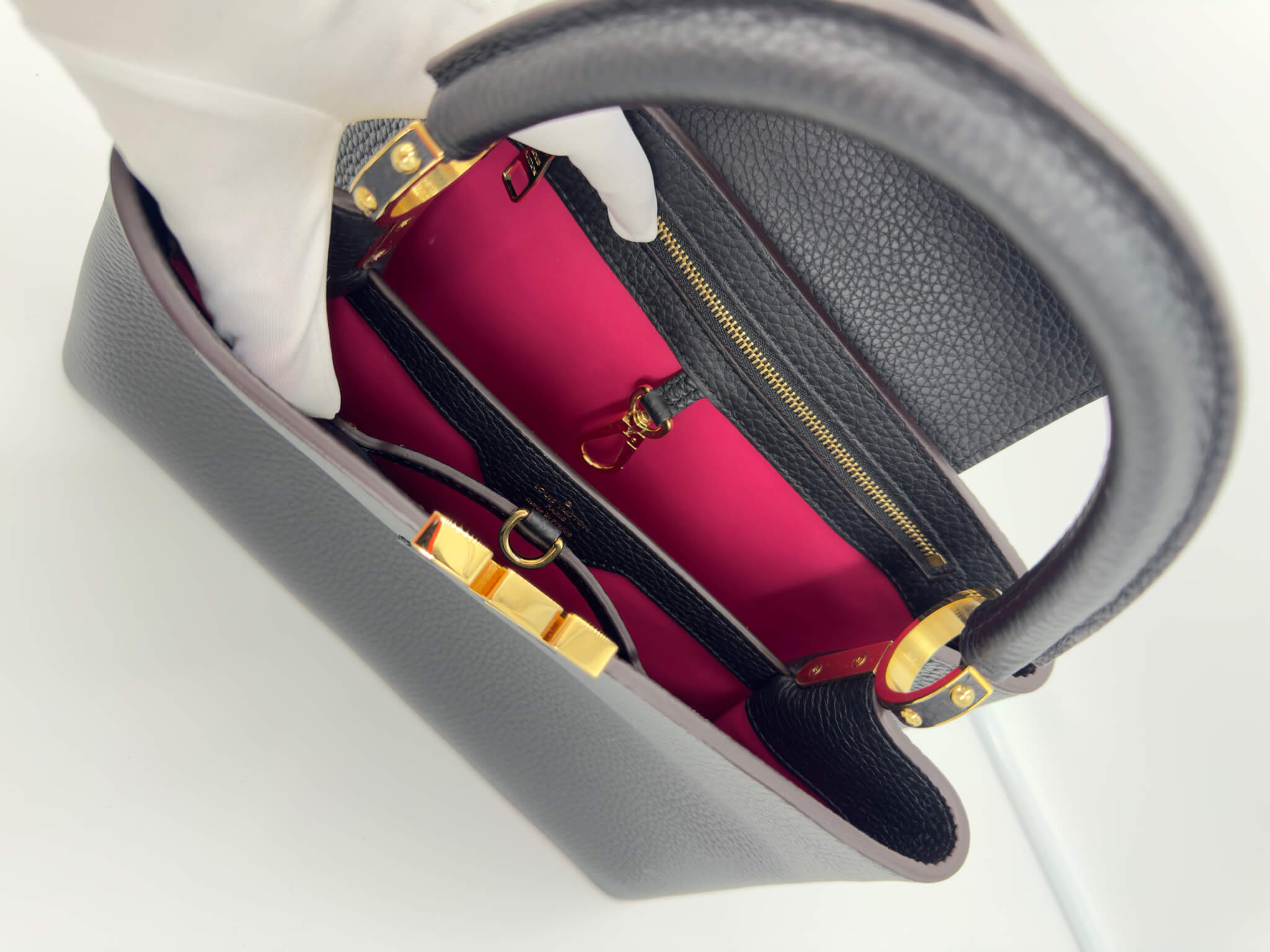 Sac Louis Vuitton Capucines MM en cuir taurillon noir, doublure intérieure rose contrastée, modèle à poignée supérieure, porté main ou épaule grâce à sa bandoulière amovible. Belle structure, signature LV en laiton doré, rabat intérieur modulable et compartiments bien pensés. Full set : sac de protection, boîte, bandoulière.