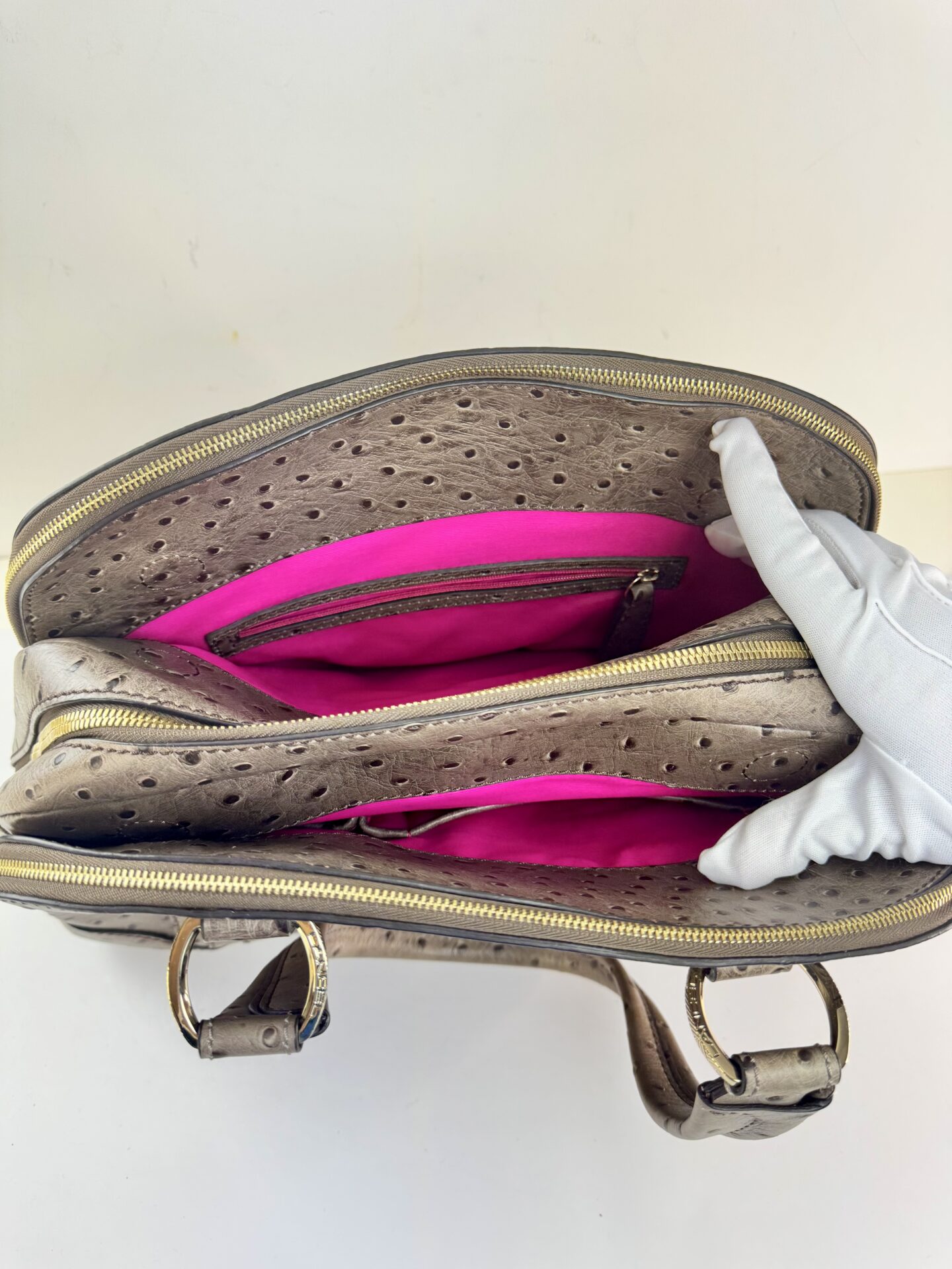 Il se distingue par son intérieur en cuir rose fuchsia, son cadenas avec clé, ainsi que ses finitions raffinées. Porté une seule fois, il est en excellent état. Une pièce rare et luxueuse pour collectionneuses et amatrices de maroquinerie d’exception.