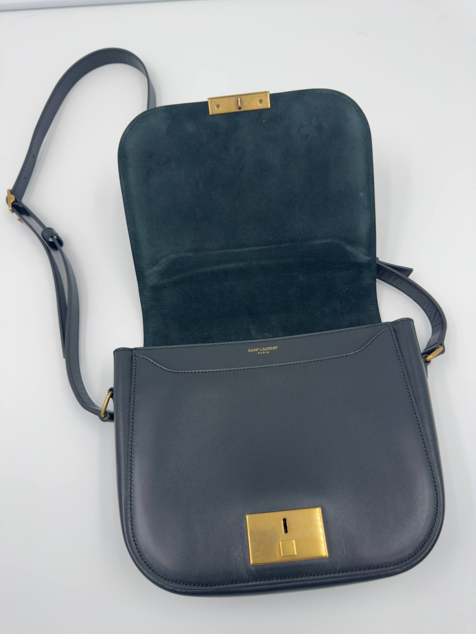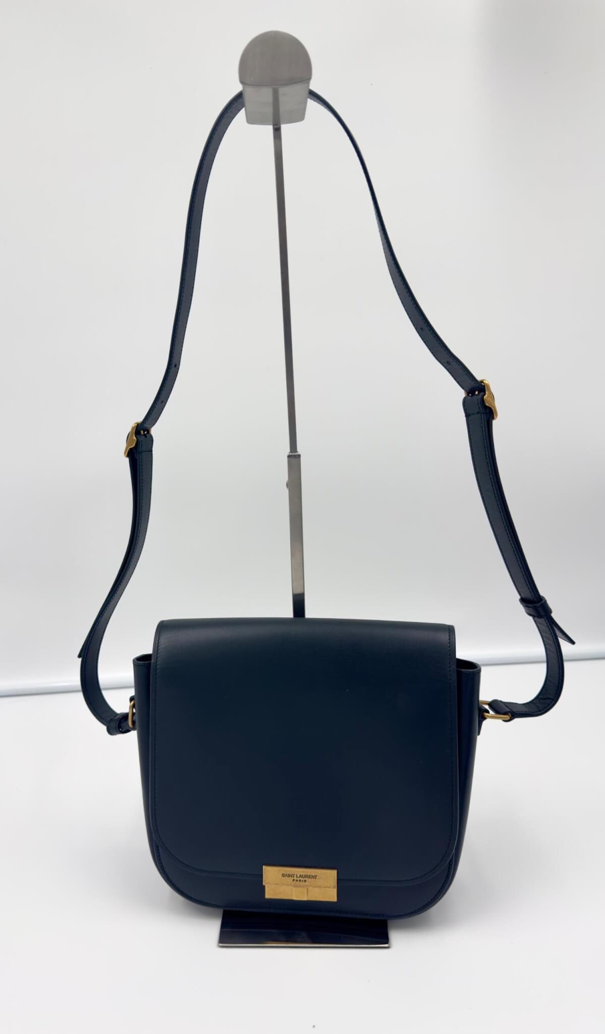 Sac Betty Satchel Saint Laurent Paris en cuir lisse bleu nuit, état neuf. Fermoir doré en laiton gravé Saint Laurent, bandoulière ajustable pour un porté épaule ou croisé. Intérieur croute de cuir de veau 100%, spacieux à compartiments, parfait pour un usage quotidien chic et structuré. Un modèle emblématique de la Maison, alliant minimalisme et sophistication. Vendu avec son dustbag d’origine et sa carte d’authenticité — la pièce idéale pour sublimer un look citadin avec discrétion et allure.
