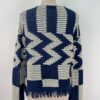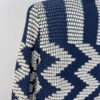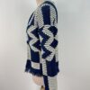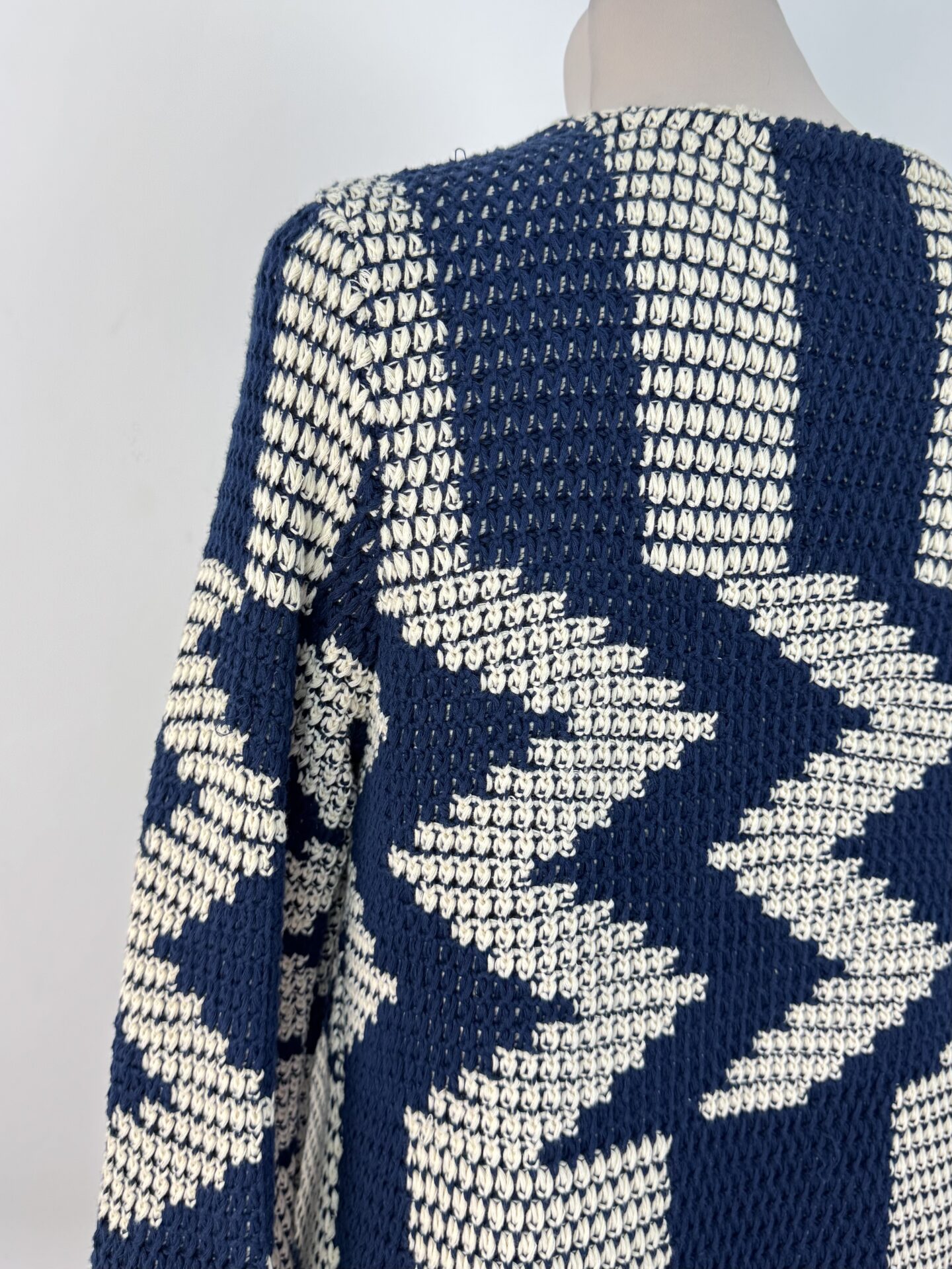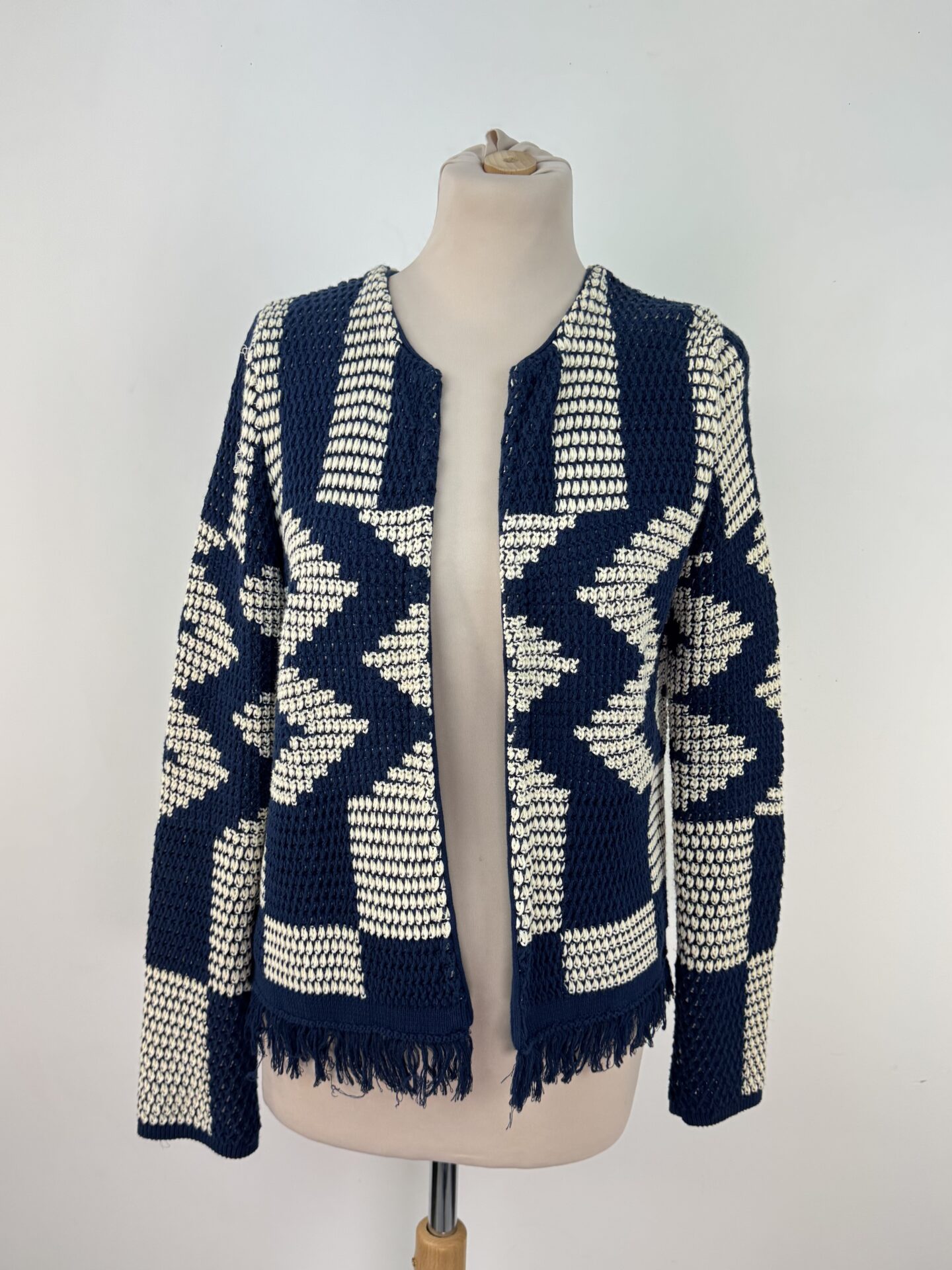 Veste Maliparmi en maille 100% coton, au motif géométrique bleu marine et blanc. Ce modèle présente une coupe droite ouverte sans fermeture et se distingue par sa finition frangée à la base.