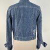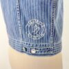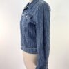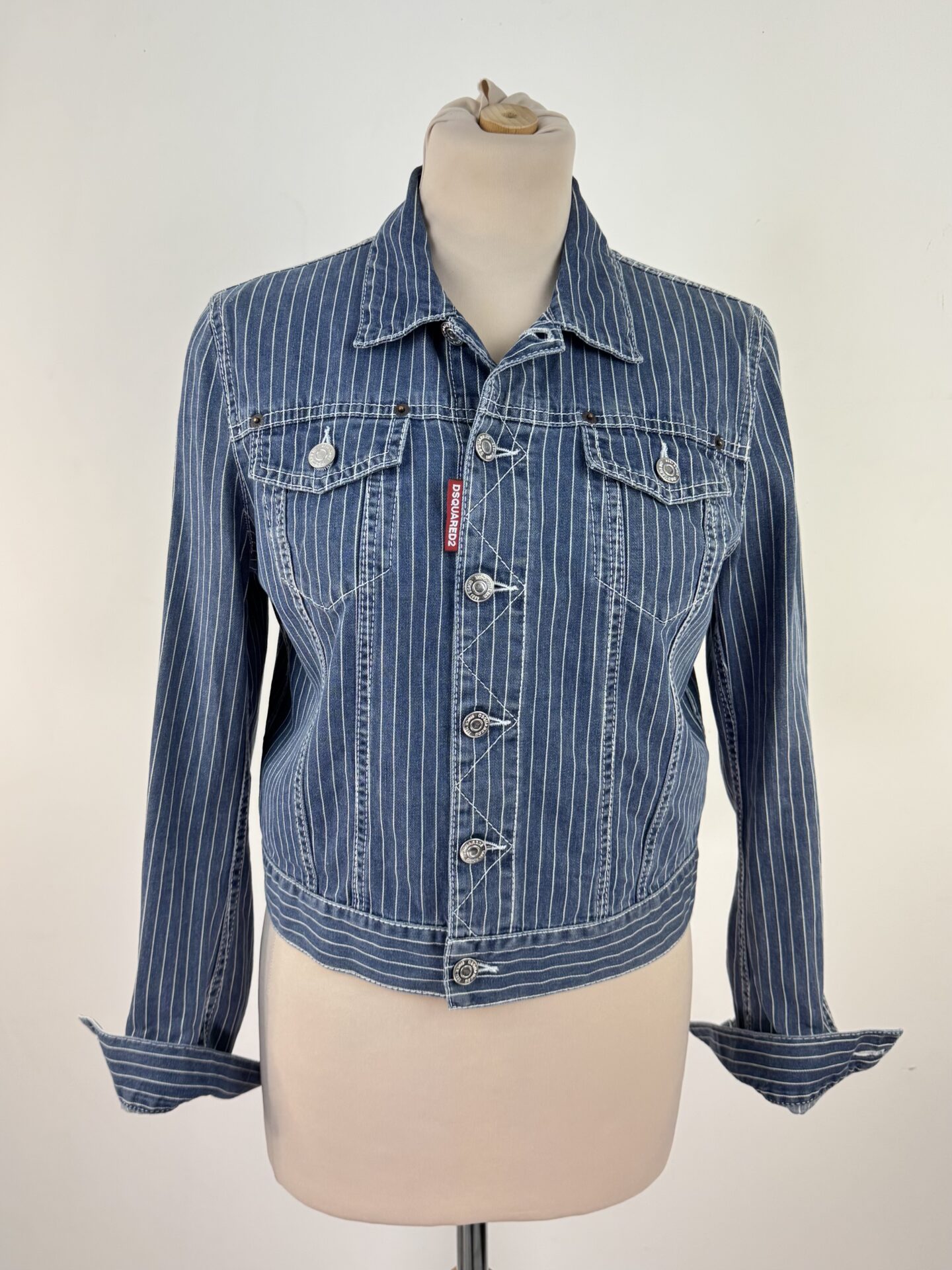 Veste en jean DSQUARED confectionnée en coton. Ce modèle bleu à fines rayures blanches présente une coupe ajustée, deux poches poitrine à rabat boutonné et une fermeture par boutons métalliques siglés. Le col classique et les surpiqûres contrastées renforcent son allure authentique et moderne.