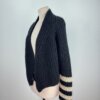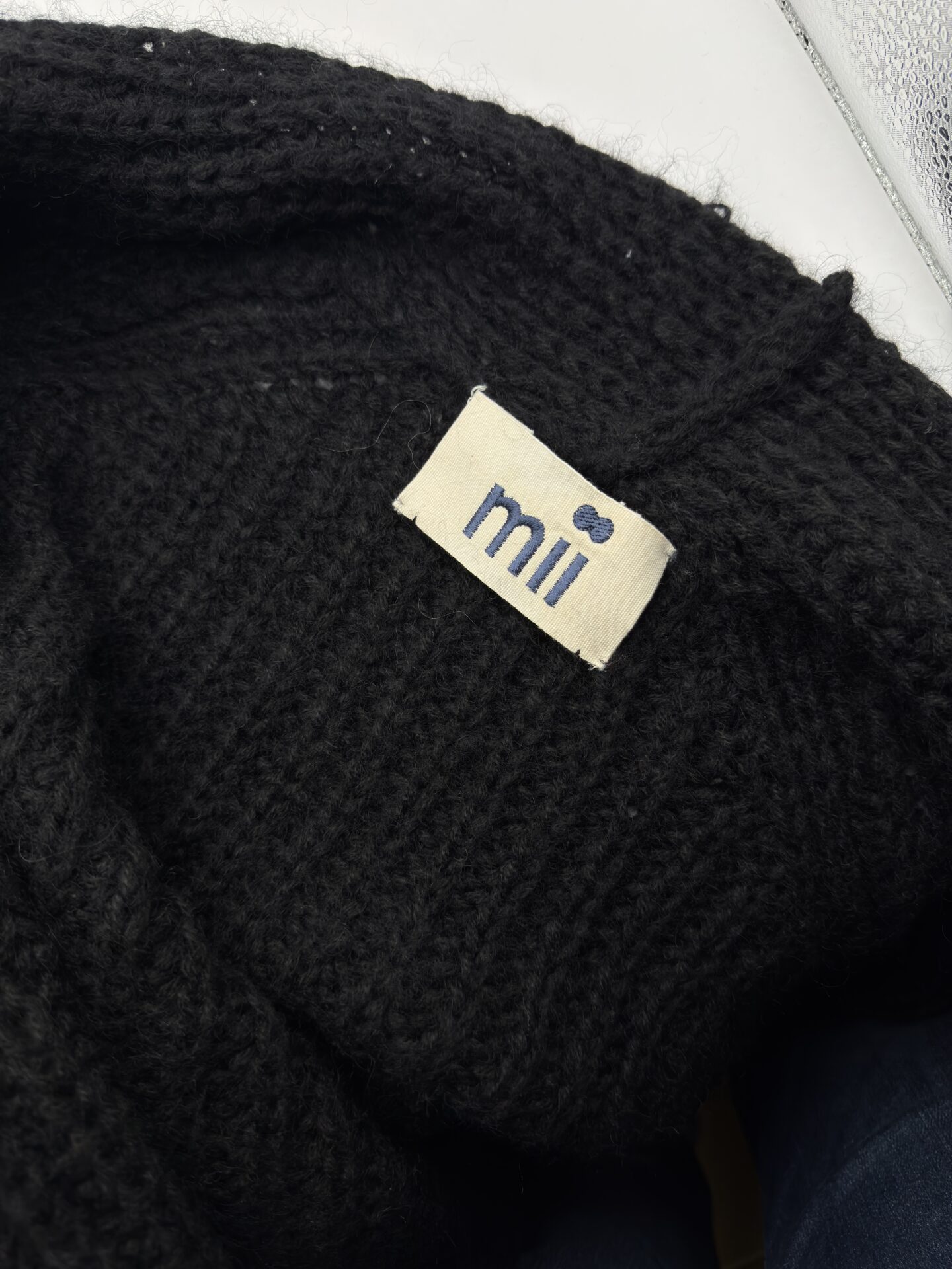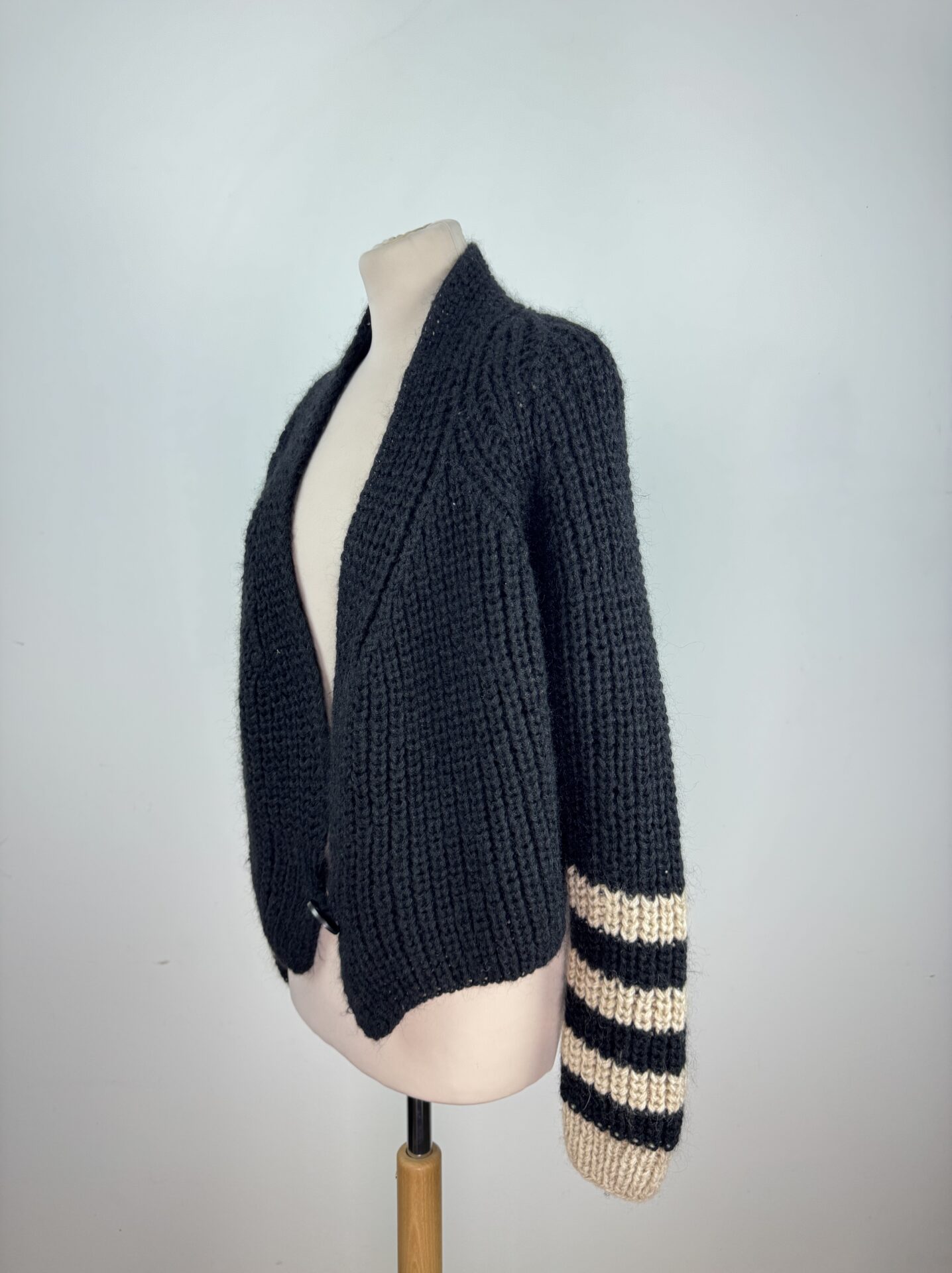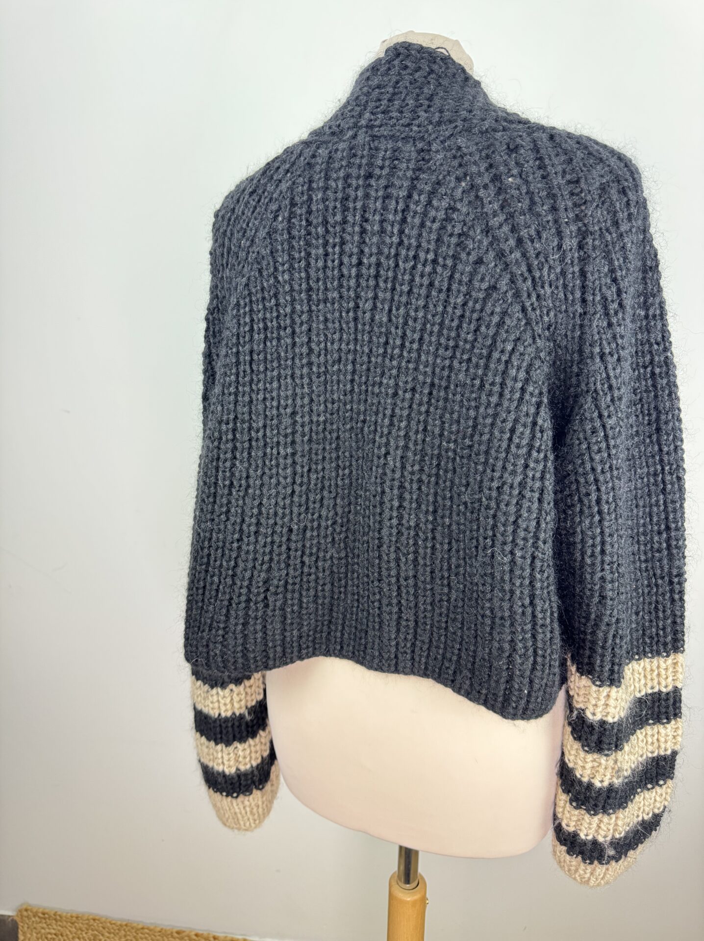 Pull Mii à grosse maille noire, fermé par un bouton, avec manches à rayures contrastantes. Confectionné en mélange noble (35 % alpaga, 35 % laine, 10 % mohair), il offre chaleur et confort tout en affichant un style décontracté et moderne.